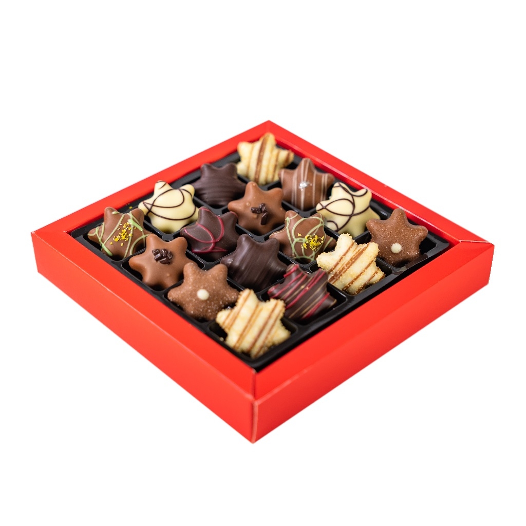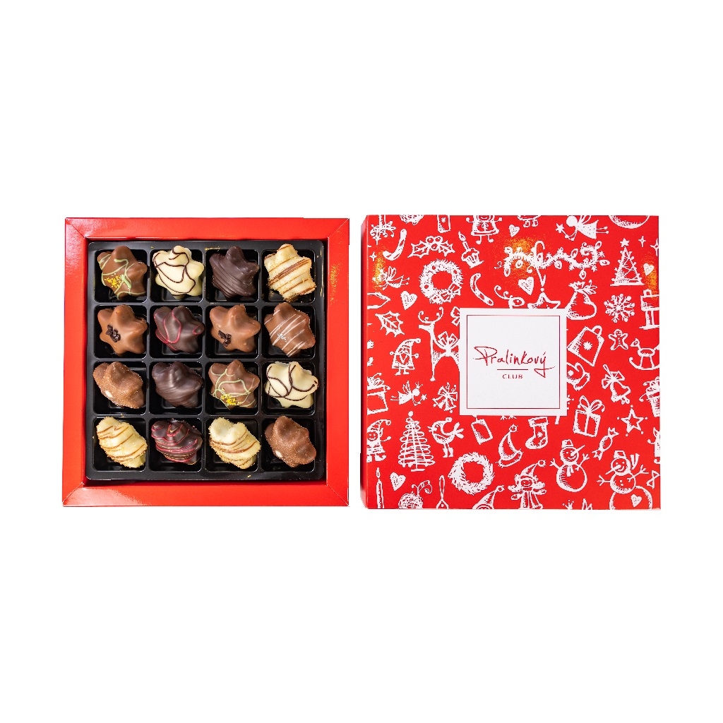 Objevte kouzlo vánoc s našimi vánočními hvězdičkami – exkluzivním mixem pralinek s příchutěmi, které vás přenesou do sváteční pohody. Užijte si jemné tóny vanilky a nugátu, skořice, šampaňského, vlašského ořechu a karamelu. Dopřejte si také lahodný nugát z pražených mandlí, florentinský mandlový nugát, amarettini, vánoční bowle, pistácie s krokantem a rumovou pralinku. Ideální dárek pro každého milovníka čokoládových lahůdek, který přinese pravou vánoční atmosféru.