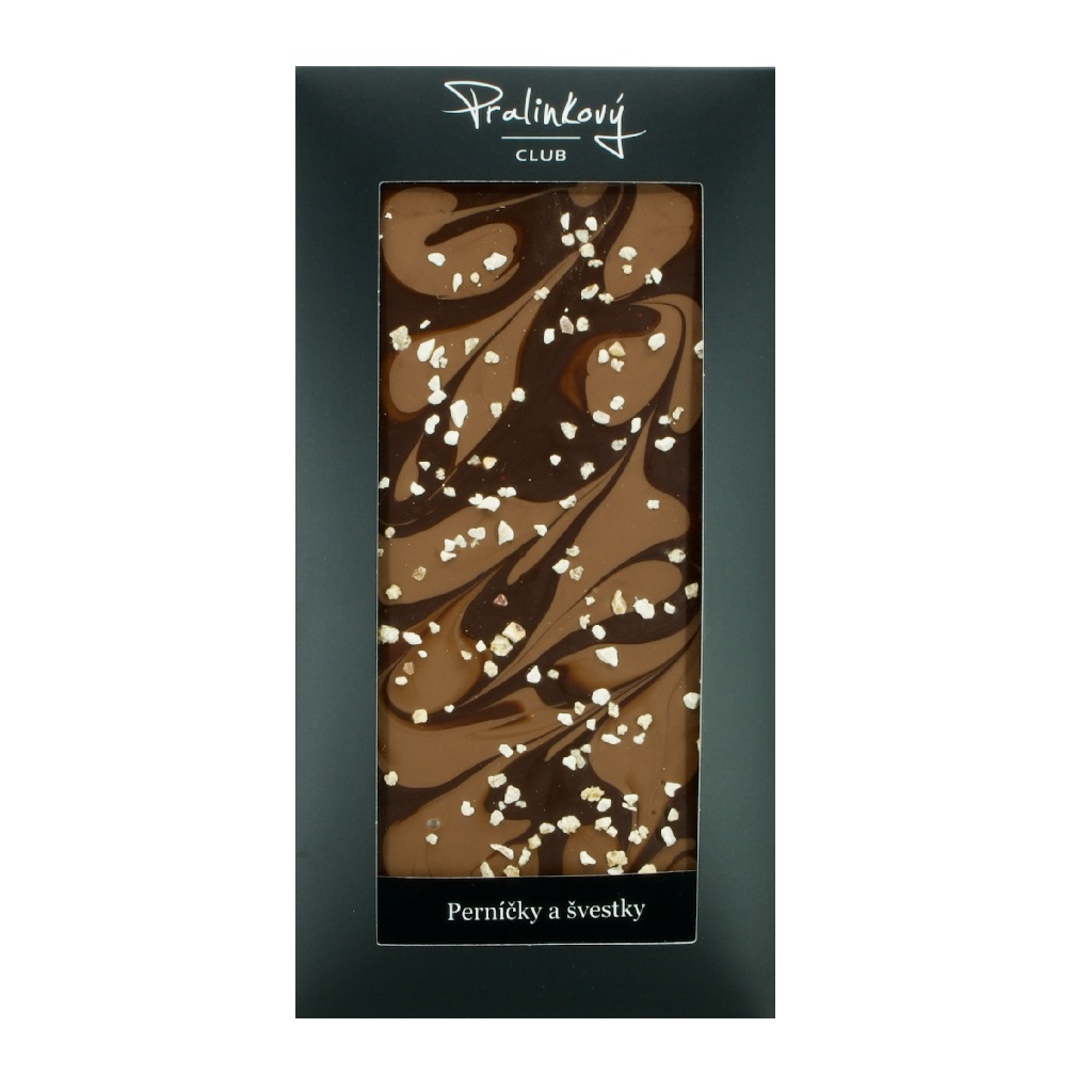 Hořká čokoláda se sušenkovými kousky, švestkami a mandlovou čokoládou.