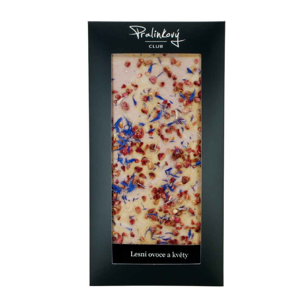 Bílá čokoláda s malinami, borůvkami a květy chrpy pro jemně ovocný zážitek.