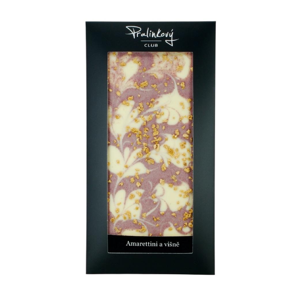 Bílá a třešňová čokoláda s křupavými kousky sušenek amarettini.