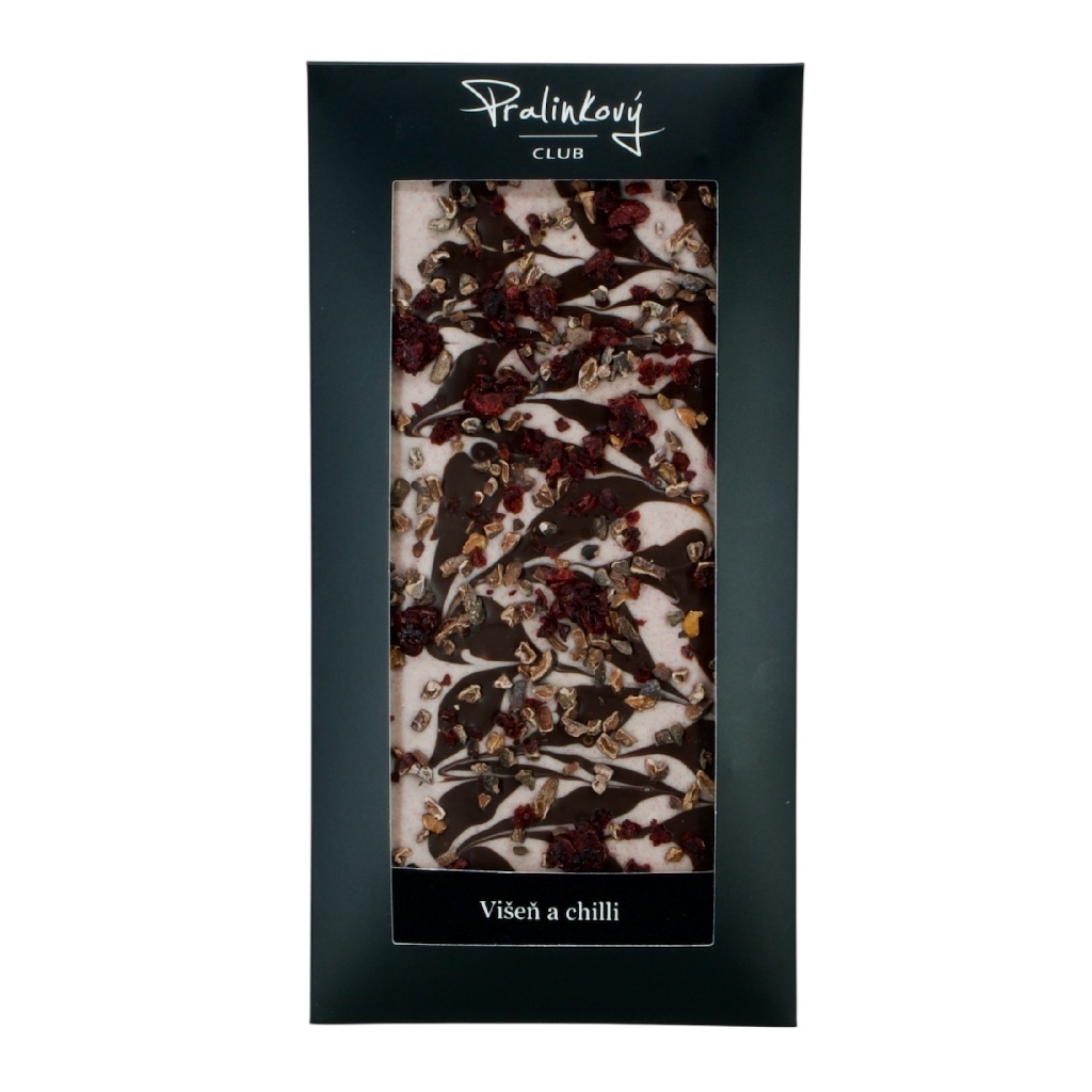 Spojení šťavnatých višní, 70% hořké čokolády s chilli a křupavých kakaových bobů.